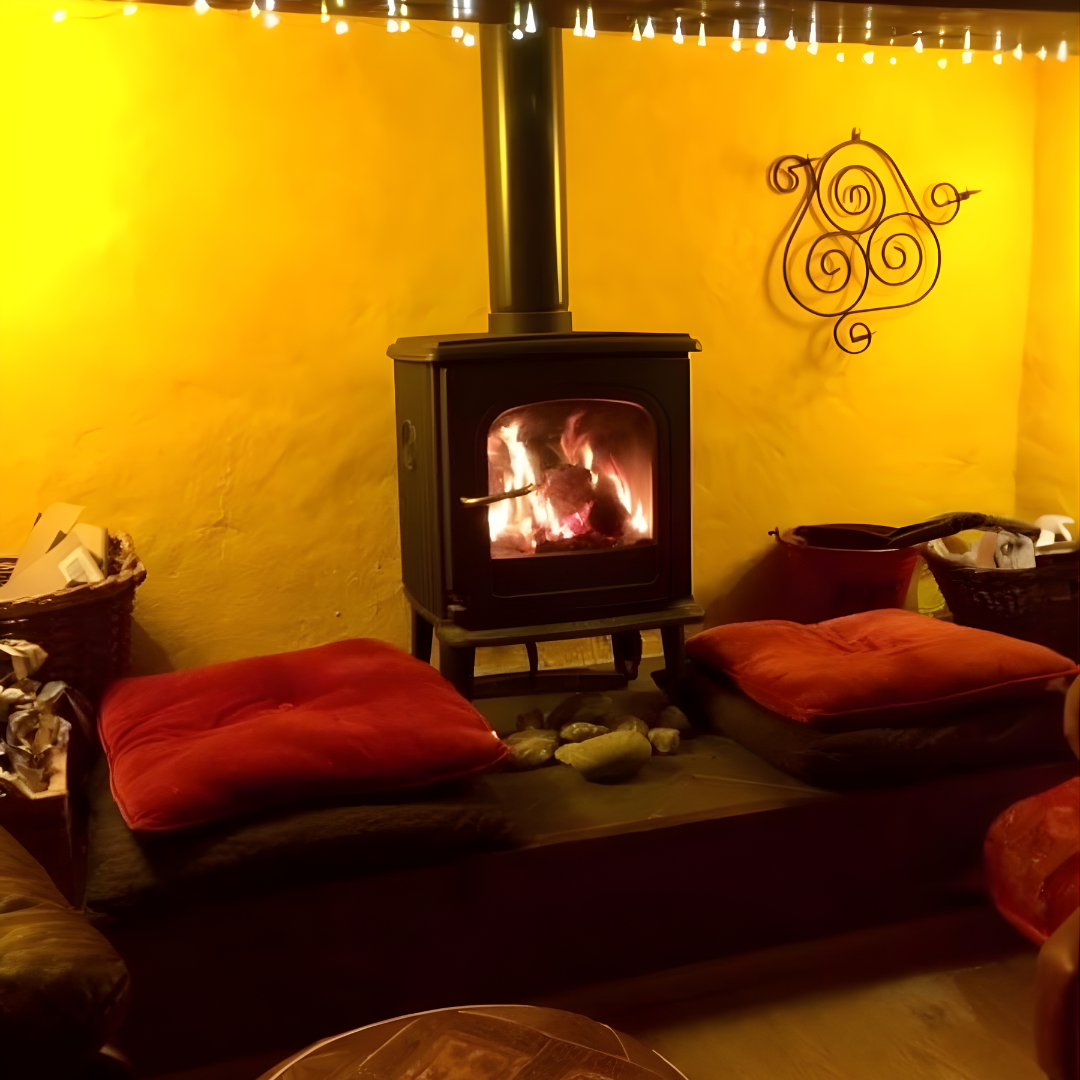 Inside and out, the space feels warm, grounded, and alive. A wood-burning stove anchors the heart of the home, creating a sense of comfort and togetherness.